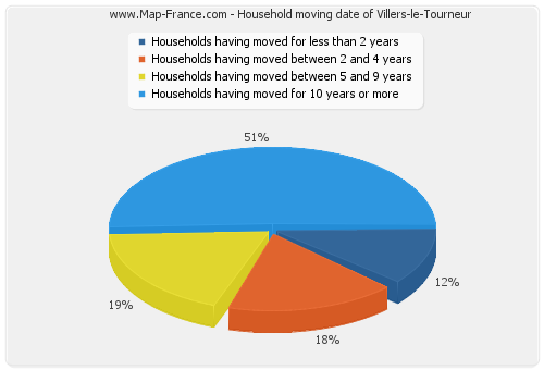 - Number of households of Villers-le-Tourneur having moved between 2 and 5 years : 12 - Number of households of Villers-le-Tourneur having moved between 5 and 9 years : 13 - Number of households of Villers-le-Tourneur having moved for 10 years or more : 35 |