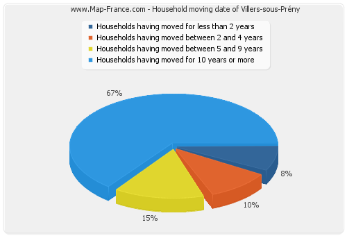 - Number of households of Villers-sous-Prény having moved between 2 and 5 years : 14 - Number of households of Villers-sous-Prény having moved between 5 and 9 years : 20 - Number of households of Villers-sous-Prény having moved for 10 years or more : 91 |