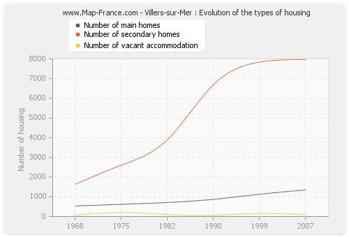 The following graphs show the history of the number and the type of housing of Villers-sur-Mer from 1968 to 2007. The second graph is drawn in cubic interpolation. This allows to obtain more exactly the number of accommodation of the city of Villers-sur-Mer years where no inventory was made.