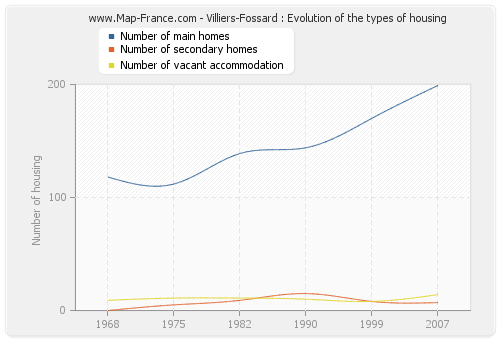 The following graphs show the history of the number and the type of housing of Villiers-Fossard from 1968 to 2007. The second graph is drawn in cubic interpolation. This allows to obtain more exactly the number of accommodation of the town of Villiers-Fossard years where no inventory was made.