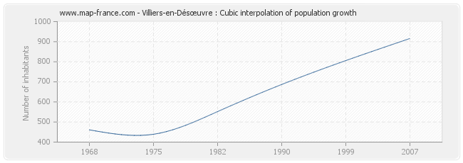 This curve shows the history of the population of Villiers-en-Désœuvre from 1968 to 2007 in cubic interpolation. This provides more precisely the population of the municipality of Villiers-en-Désœuvre the years where no census has been taken.
