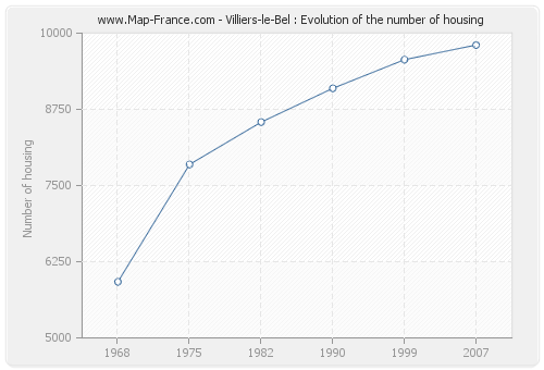 The population of Villiers-le-Bel was 27 091 inhabitants in 2007, 26 143 inhabitants in 1999, 26 110 inhabitants in 1990, 24 808 inhabitants in 1982, 21 876 inhabitants in 1975 and 19 119 inhabitants in 1968. Meanwhile, the number of housing of Villiers-le-Bel was 9 806 in 2007, 9 565 in 1999, 9 095 in 1990, 8 541 in 1982, 7 846 in 1975 and 5 920 in 1968.
