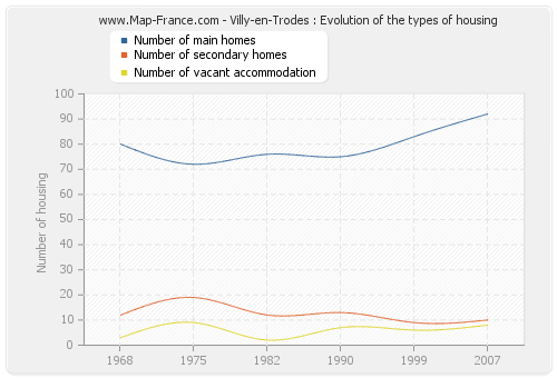 The following graphs show the history of the number and the type of housing of Villy-en-Trodes from 1968 to 2007. The second graph is drawn in cubic interpolation. This allows to obtain more exactly the number of accommodation of the town of Villy-en-Trodes years where no inventory was made.
