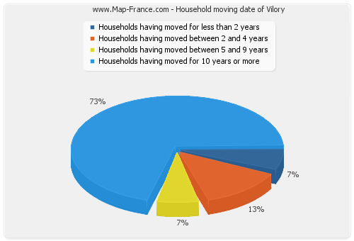 - Number of households of Vilory having moved between 2 and 5 years : 4 - Number of households of Vilory having moved between 5 and 9 years : 2 - Number of households of Vilory having moved for 10 years or more : 22 |