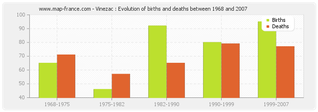 Vinezac : evolution of births and deaths from 1968 to 2007