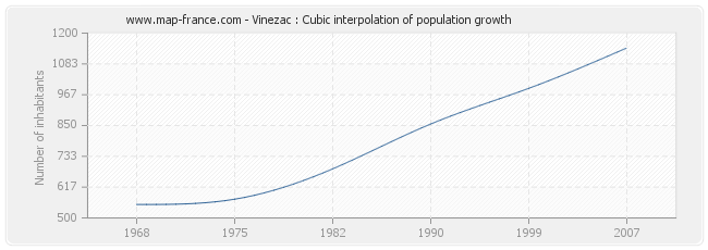 This curve shows the history of the population of Vinezac from 1968 to 2007 in cubic interpolation. This provides more precisely the population of the municipality of Vinezac the years where no census has been taken.