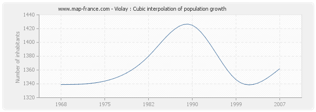 This curve shows the history of the population of Violay from 1968 to 2007 in cubic interpolation. This provides more precisely the population of the municipality of Violay the years where no census has been taken.