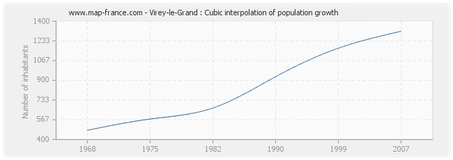 This curve shows the history of the population of Virey-le-Grand from 1968 to 2007 in cubic interpolation. This provides more precisely the population of the municipality of Virey-le-Grand the years where no census has been taken.