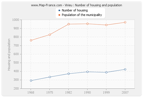 The population of Virieu was 971 inhabitants in 2007, 940 inhabitants in 1999, 954 inhabitants in 1990, 950 inhabitants in 1982, 828 inhabitants in 1975 and 761 inhabitants in 1968. Meanwhile, the number of housing of Virieu was 424 in 2007, 389 in 1999, 395 in 1990, 373 in 1982, 335 in 1975 and 293 in 1968.
