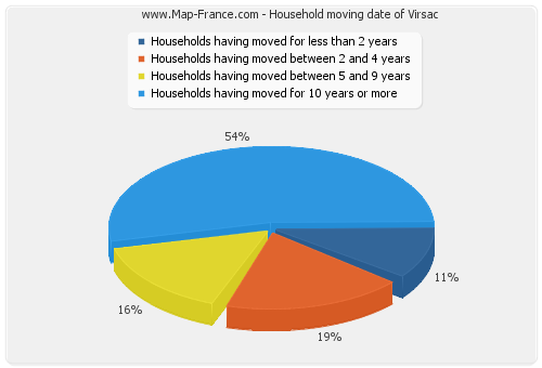 - Number of households of Virsac having moved between 2 and 5 years : 61 - Number of households of Virsac having moved between 5 and 9 years : 51 - Number of households of Virsac having moved for 10 years or more : 176 |