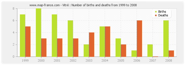 Population of Vitré was 516 inhabitants in 2007, 513 inhabitants in 1999, 477 inhabitants in 1990, 365 inhabitants in 1982, 375 inhabitants in 1975 and 433 inhabitants in 1968.