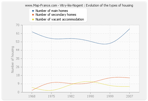 The number of housing of Vitry-lès-Nogent was 87 in 2007, 73 in 1999, 74 in 1990, 73 in 1982, 68 in 1975 and 70 in 1968.