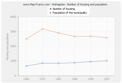 The population of Wahagnies was 2 599 inhabitants in 2007, 2 688 inhabitants in 1999, 2 674 inhabitants in 1990, 2 911 inhabitants in 1982, 3 190 inhabitants in 1975 and 2 504 inhabitants in 1968. Meanwhile, the number of housing of Wahagnies was 1 025 in 2007, 961 in 1999, 891 in 1990, 849 in 1982, 858 in 1975 and 669 in 1968.