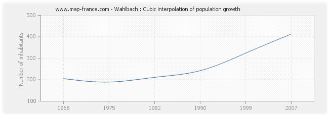 This curve shows the history of the population of Wahlbach from 1968 to 2007 in cubic interpolation. This provides more precisely the population of the municipality of Wahlbach the years where no census has been taken.
