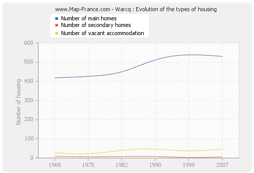 The number of housing of Warcq was 583 in 2007, 578 in 1999, 566 in 1990, 498 in 1982, 455 in 1975 and 454 in 1968.