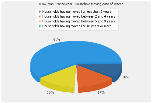 - Number of households of Warcq having moved between 2 and 5 years : 75 - Number of households of Warcq having moved between 5 and 9 years : 77 - Number of households of Warcq having moved for 10 years or more : 326 |