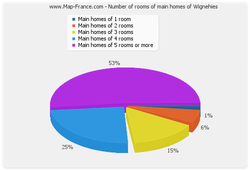 - Number of main homes of Wignehies of 1 room : 9 - Number of main homes of Wignehies of 2 rooms : 73 - Number of main homes of Wignehies of 3 rooms : 183 - Number of main homes of Wignehies of 4 rooms : 183 - Number of main homes of Wignehies of 5 rooms and more : 652 |