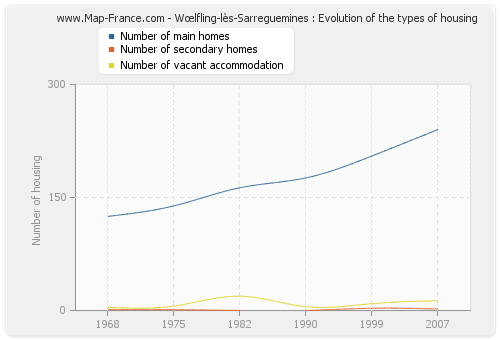 The following graphs show the history of the number and the type of housing of Wœlfling-lès-Sarreguemines from 1968 to 2007. The second graph is drawn in cubic interpolation. This allows to obtain more exactly the number of accommodation of the town of Wœlfling-lès-Sarreguemines years where no inventory was made.
