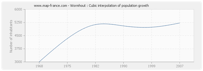 Population of Wormhout was 5 223 inhabitants in 2007, 4 983 inhabitants in 1999, 5 057 inhabitants in 1990, 5 133 inhabitants in 1982, 4 332 inhabitants in 1975 and 3 004 inhabitants in 1968.