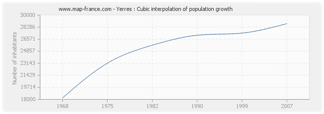 This curve shows the history of the population of Yerres from 1968 to 2007 in cubic interpolation. This provides more precisely the population of the municipality of Yerres the years where no census has been taken.