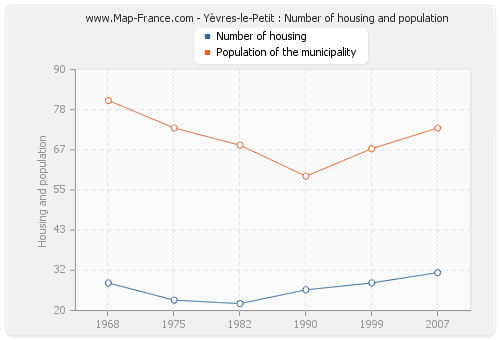 The population of Yèvres-le-Petit was 73 inhabitants in 2007, 67 inhabitants in 1999, 59 inhabitants in 1990, 68 inhabitants in 1982, 73 inhabitants in 1975 and 81 inhabitants in 1968. Meanwhile, the number of housing of Yèvres-le-Petit was 31 in 2007, 28 in 1999, 26 in 1990, 22 in 1982, 23 in 1975 and 28 in 1968.