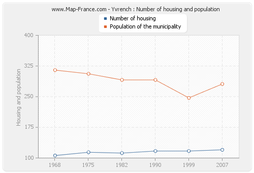 The population of Yvrench was 281 inhabitants in 2007, 247 inhabitants in 1999, 291 inhabitants in 1990, 291 inhabitants in 1982, 306 inhabitants in 1975 and 315 inhabitants in 1968. Meanwhile, the number of housing of Yvrench was 120 in 2007, 117 in 1999, 117 in 1990, 112 in 1982, 114 in 1975 and 106 in 1968.